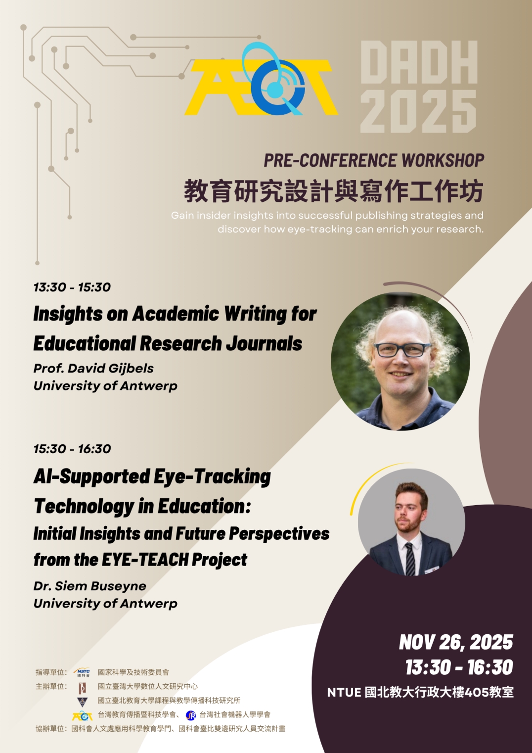 To kick off the upcoming TAECT2025, our organization, together with the Center for Digital Humanities Studies at National Taiwan University, the Institute of Curriculum and Instructional Communication Technology at National Taipei University of Education, and the Taiwan Society for Social Robotics, co-hosted a pre-TAECT2025 workshop. We invited Professor David Gijbels from the University of Antwerp, Belgium, and Dr. Siem Buseyne, a postdoctoral researcher, to share their experiences in educational research design and academic writing.